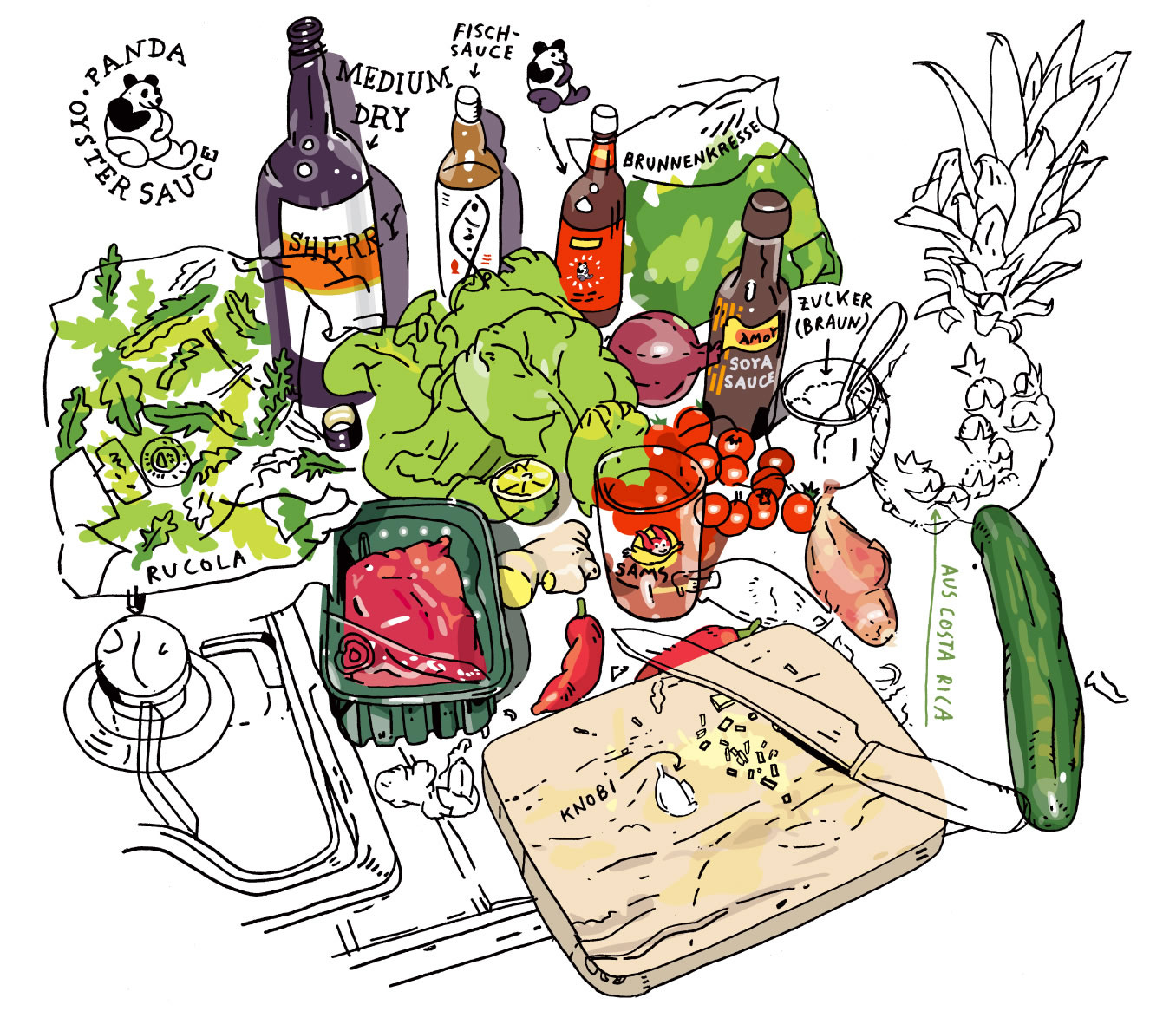 For about four years I had a beautiful time contributing a quarter-page illustration for a food column in the German edition of GQ magazine. Each month the magazine’s art director sent me a new recipe, I bought the ingredients and then cooked the meal at home. During the cooking, I took photos which I used as references for my drawings. Sometimes I drew the finished meal, other times just a still life portraying the ingredients. I also enjoyed drawing and documenting the prepping and cooking processes.