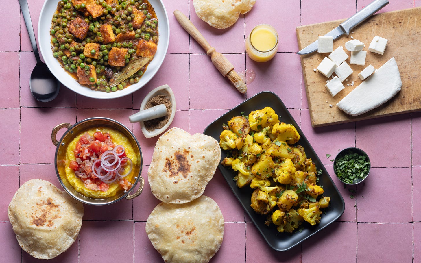 Watching Trina work is a joy. “The thing with food,” she explains, “is that dishes can die.” Great photography takes time, and a stylist’s job is to keep food looking as fresh as it did when it came out of the hot oil (or off the stovetop) while the photographer fiddles with lighting, composition, and angle. Trina’s signature gold tweezers and a spray bottle are always at the ready while she’s on set: “A slight rearrangement, or a little bit of water, can make fruits and veggies catch the light, and that glint makes things look fresh.” A light brushing of oil is another way to get that sheen. Trina is also extremely handy with paper goods—her stuffing of rotis with paper towels to preserve the flatbreads’ hot-off-the-stovetop puff is something my family still talks about.